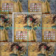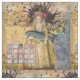 Dive into a unique blend of vintage elegance and surreal fantasy with this striking design. A classically adorned woman, reminiscent of historical portraiture, is depicted holding a large fish, creating an unexpected and intriguing focal point. She wears a feathered crown, a delicate veil, and a richly patterned gown, suggesting a regal or noble presence. Her modern eyeglasses add a whimsical, anachronistic touch. The background is a tapestry of muted gold tones, subtle patterns, and hints of nature, including flying birds and a large butterfly wing. A grid of muted colour swatches on the left side adds a contemporary, artistic flair to this captivating and imaginative piece.
