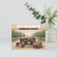 Vintage pistachio orchard and tractor postcard with a bin of pistachios.