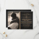 This beautiful charcoal black 5"x7" wedding save the date announcement can be customised with your own engagement photo. With creamy gold text, it has a vintage, old fashioned feel with old-timey letter design, including elaborate script elements, a decorative banner, stars and a swirly ampersand. The fancy invitation is inspired by both vintage design and stylish posters. The text reads: "You're Invited to the wedding reception of [customisable name] & [customisable name] [customisable date] [customisable time]. Please Join Us for an Unforgettable Celebration". Further personalise the invitation with the reception information and address, in the box with dotted border.