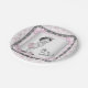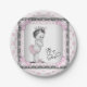 Adorable princess baby girl princess baby shower plates with pretty pink and white lace and pink bow background. These cute princess baby shower paper plates can be customised with text in the font style and colour of your choice.