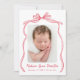 Celebrate your little one's arrival with our elegant Vintage Red Bow birth announcement. Showcase your newborn's photo framed by a charming red bow, with your baby’s name in a lovely handwritten red script. Below, you can add birth details like weight, length, and date. The back offers space for an extra photo and a personalised message to loved ones. This customisable keepsake is the perfect way to announce your newest family member with style and grace!