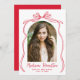 Announce your graduate’s milestone with this elegant and timeless graduation announcement, featuring a photo displayed in an arch-shaped frame, accented by a hand-drawn red bow and ribbon on a classic white background. The graduate’s name is highlighted in a stylish handwritten red script, with their school and graduation year elegantly displayed below. The back of the announcement includes a horizontal photo and space for a custom message, perfect for sharing gratitude, future plans, or party details. This sophisticated design offers a modern yet vintage-inspired way to celebrate your high school or college graduate’s achievement!