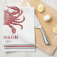 Vintage illustration of a red crab on a large personalised kitchen towel, perfect for beach and bay lovers alike.