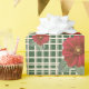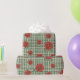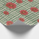 A repeating pattern of red blooming flowers with green leaves placed over a classic green and cream plaid grid.