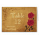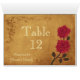 Beautiful red roses on a vintage brown faux textured background with floral scroll corners. Very stylish design for your table seating number place cards for your special day. The text can easily be customised for any occasion wedding, baby shower, anniversary, graduation, sweet sixteen, birthday or other party event. The table number card is designed to be turned inside out so that the design is visible from both sides. You can also add guests names or other seating information by using the "Customise It" menu.