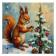 A whimsical vintage Christmas scene featuring a red squirrel decorating a tiny pine tree with winter berries. A sweet and nostalgic woodland moment perfect for holiday products.