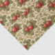 A charming vintage-inspired repeating pattern that celebrates ripe strawberries entwined with graceful botanical scrollwork. Lush red berries with delicate white blossoms nestle among richly detailed green leaves and curling vines, set against a warm cream background dotted with subtle speckles. The flowing composition and ornate foliage evoke classic European wallpaper and Arts & Crafts–era illustration, giving the design a timeless, storybook quality.