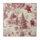 A seamless vintage Christmas toile pattern ceramic tile rendered in deep red linework on a cream background, capturing the charm of a winter village scene. The design features Santa Claus carrying gifts, snow-covered cottages, evergreen trees, reindeer, and peaceful snowy paths — all drawn in the elegant, detailed style of classic toile de Jouy. This nostalgic and festive pattern evokes the warmth and tradition of an old-fashioned Christmas.