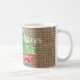 Festive holiday mug features burlap background and watercolor illustration of vintage red truck decked out for the holidays with fresh cut Christmas trees. Customisable "Happy Holidays" in rustic font overlay