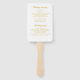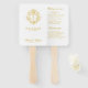 Baroque wedding program fans with an ornate gold crest design offer a luxurious and functional detail for elegant ceremonies. The front features a regal rococo-inspired monogram crest with intricate scrollwork and floral embellishments, creating a striking first impression steeped in regency-style sophistication. Below, classic serif and flowing script fonts present the couple’s names and wedding date in radiant gold. The reverse side organises the ceremony and wedding party details in a clean, easy-to-read layout, all styled in matching golden text. Perfect for warm-weather weddings, this decorative fan combines aristocratic charm with practical elegance for a timeless, high-society ambiance.