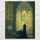 Vintage illustration religion Christianity design featuring a religious nun playing music on a traditional church musical instrument, the organ. There is a beautiful stained glass window with an image of Jesus Christ behind her.