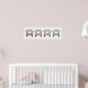 This fun poster features the front view of four vintage retro camper van buses in shades of green, pink, yellow and blue. A cute addition to a nursery.