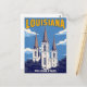 Capture the historic charm of the Pelican State with this striking, vintage-style travel postcard. The design features an illustration of a beautiful, iconic cathedral, likely the St. Louis Cathedral in New Orleans, set against a bright blue sky with wispy clouds. The bold, retro lettering declares "LOUISIANA" and the state nickname. Perfect for travel enthusiasts, architecture lovers, or sending a unique greeting from your New Orleans trip. This design has the look and feel of a classic mid-century travel poster.