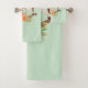 A towel set with a charming and fanciful image of an old fashioned rocking horse with a pretty floral bouquet in pink and yellow. Celery green background.