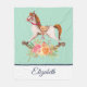 Personalised blanket with a charming and fanciful image of an old fashioned rocking horse with a pretty floral bouquet in pink and yellow. The background is a light green colour.