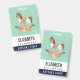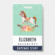 Personalised name badge with a charming and fanciful image of an old fashioned rocking horse with a pretty floral bouquet in pink and yellow. The background is a light green shabby damask pattern.