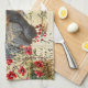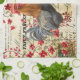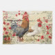 Vintage design utilising rooster and hen, receipt, and leafy plants with red flowers in a collage.