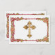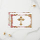 This elegant save the date card features a vintage rose frame and a gold Christian cross.