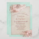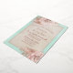 This romantic and elegant wedding invitation features a vintage floral design with real rose gold foil. Pink and blush roses with glitter accents are placed in opposite corners. The background is a faded teal parchment pattern.