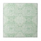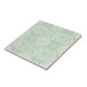 A seamless vintage-inspired pattern ceramic tile featuring an intricate interplay of classical figures, floral motifs, and geometric frameworks. Rendered in a calming two-tone palette of light sage green and pale cream, the design centers on a graceful scene depicting a man in a long coat and a woman holding a garland of flowers, set within ornate borders of cross motifs, diamonds, and stylized blossoms. The fine linework and structured symmetry evoke the charm of historical decorative arts, blending storytelling with elegant geometry. Ideal for those that seek a touch of refined nostalgia and timeless artistry.