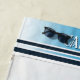 Beach towel featuring a fine art painting of a vintage sailor at a harbour. The background is a navy blue striped design. Beautiful for a sailor, on the boat or for a coastal guesthouse.