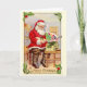 This adorable image of Santa sitting down in his workshop painting was scanned from an vintage -- antique actually -- postcard. Santa is holding brushes and a palette while he paints the roof of a dollhouse. this image is framed with holly and mistletoe branches.