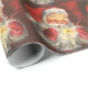 Christmas wrapping paper with image of jolly Santa Claus wearing his red mittens and cap, blowing out a white candle.