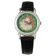 A watch with a retro image featuring a smiling happy Santa Claus surrounded by a pine wreath with a sprig of holly in his cap.