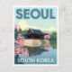 Share the tranquil beauty of Seoul, South Korea, with this beautiful vintage travel poster style postcard. The design features a traditional Korean palace pavilion, likely the Hyangwonjeong Pavilion at Gyeongbokgung Palace, reflected perfectly in its pond. The scene is framed by vibrant pink cherry blossoms and lush greenery, evoking the charm of spring. This postcard is perfect for sending greetings, celebrating Korean culture, decorating with soft colors, or collecting retro Asian travel art. A peaceful and elegant piece for travel lovers.