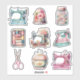 This 9-sticker pack features beautiful watercolor illustrations of  vintage sewing elements. Included are sewing  machines, a thimble, button jar, box containing spools of thread, iron, sewing scissors, and pincushion.