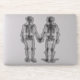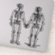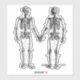Vintage darkly humourous black and white image of a skeleton couple, one facing front, the other facing back, seemingly holding hands and looking into each other's eyes, as though they are about to begin a dance. Each anatomically correct skeleton is diagrammed with numbered bones, at one time possibly used in a science laboratory from another century, or a classroom receiving a lesson in the human skeletal system. Here the romantic couple is offered as a laptop sticker.