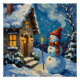 A heartwarming vintage Christmas artwork featuring a joyful snowman outside a glowing winter cottage. Antique tones and nostalgic charm make it a timeless holiday scene.
