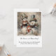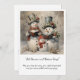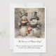 This charming Christmas card illustration features a heartwarming trio of snowmen standing together in a softly falling winter snow. A mom and dad snowman, dressed in vintage top hats adorned with winter greenery and roses, hold open songbooks as they joyfully carol. Delicate musical notes float through the air, adding a sense of melody and festive cheer. Between them stands a sweet baby snowman, bundled in a cozy red knit hat and scarf, gazing up with an innocent smile. The muted, snowy woodland background and gentle color palette create a nostalgic, storybook feel, evoking warmth, togetherness, and the timeless magic of the holiday season. Personalize with your own information.