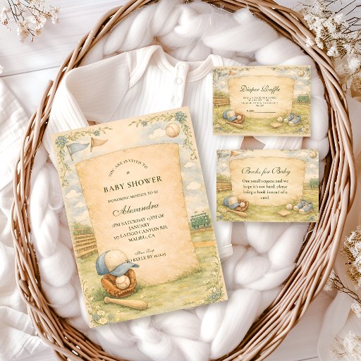 Celebrate a little slugger on the way with this vintage baseball–inspired baby shower design. Featuring a charming storybook illustration style with classic baseball details, soft greens, warm parchment tones, and nostalgic field elements, this design is perfect for a sweet, timeless sports-themed celebration. Ideal for moms who love traditional Americana, vintage sports aesthetics, and a cozy, illustrated look that feels both playful and elegant.