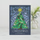 These bright and colourful 5" x 7" flat Christmas greeting cards feature a handmade watercolor stained glass window design of a green Christmas tree with a gold star and red ornaments framed in shades of blue on a navy blue background. The greeting is "Christmas," in large decorative letters with an editable greeting, "Wishing you peace, love and joy this holiday season."