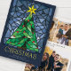 These bright and colourful 5" x 7" flat Christmas greeting cards feature a handmade watercolor stained glass window design of a green Christmas tree with a gold star and red ornaments framed in shades of blue on a navy blue background. The greeting is "Christmas," in large decorative letters with an editable greeting, "Wishing you peace, love and joy this holiday season."