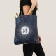 Vintage stamp pattern in blue on a tote you can personalise with your initial.