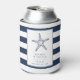 Commemorate your wedding in island vintage style with these wedding favor can coolers, featuring a starfish illustration with the couple's names, wedding date and location in navy blue. A navy and white striped background finishes this design, perfect for beach or island weddings.