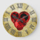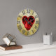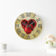 Wall clock featuring a shabby vintage style design with a steampunk style heart made up of old gears and coloured red, with metal effect Roman numerals. The background is grungy and faded with faded handwriting on it.