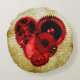 Circular Throw Pillows featuring a shabby vintage style design with a steampunk style heart made up of old gears and coloured red, the background is grungy and faded with faded handwriting on it.