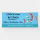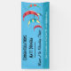 Vintage style blue kite surfing themed banner with customisable text. Colourful kites in blue, red, yellow and green fly across the cloudless summer sky over the ocean.
