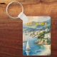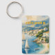 French and European Travel Advertisements - Beach, village, people, trees, blue sea and sky illustration