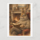 This is an AI-generated image showing a rabbit reading a book beside the fireplace.