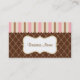 This business card has a pink striped awning that adds retro style. Customise this business card to suit your needs. Add or delete information, change the font style, font size, etc...The design is from original art. Use this stylish business card for a spa, salon, small business, home decor, florist, ice cream shop, nail salon, inn, resort, cosmetologist, preschool, hair stylist, lawn care, event planner, child care, daycare, bed and breakfast, boutique, bakery, etc...