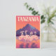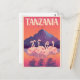 This vibrant Vintage Tanzania Travel Poster Postcard captures the stunning wildlife and dramatic landscapes of East Africa, featuring a flock of pink Flamingos standing in a lake against a backdrop of a majestic Mountain at sunset.