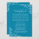 Unique wedding rehearsal dinner invitation includes creative poem wording to invite the wedding party to both the rehearsal and rehearsal dinner to follow. Elegant scrolls and floral flourishes accent the design. Colour scheme: white and teal blue