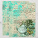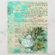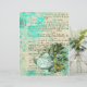 Pretty vintage collage features mint tinted teapot illustration with foliage and green butterfly on pastel aqua distressed ephemera background