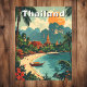 A classic vintage-style travel postcard capturing the serene beauty of a Thai beach, complete with palm trees, a traditional longtail boat, and temple architecture. Perfect for travelling, collecting, or sending notes to friends. A high-quality retro art print that evokes the golden age of Thailand travel posters.