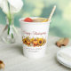 This old fashioned company holiday party paper cup features a vintage drawing of orange pumpkins, fall leaves, and cute autumn sunflowers. Nostalgic Happy Thanksgiving decor with brown script of your business name and personalised professional message on the back for clients and friends.