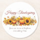 This old fashioned company holiday party coaster features a vintage drawing of orange pumpkins, fall leaves, and cute autumn sunflowers. Nostalgic Happy Thanksgiving decor with brown script of your business name and personalised professional message on the back for clients and friends.